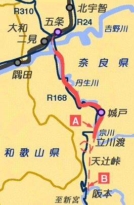 さて、この未成区間のバス専用道区間やトンネルがふんだんに登場する「萌の朱雀」、10月25日のテアトル梅田(大阪)及びCINEMA DEPT. YURAKU EAST(奈良)の関西から封切られ、そのほかの地方では11月1日の銀座テアトル西友等より公開が始まりました。私もこのほど映画を拝見させていただきました。これほど観客に媚びない(いい意味で)映画も珍しいと思いましたが、感想云々は長くなってしまいますので、ここではこのページならではの情報を。それは、映画のパンフレットに阪本線の計画略図が載っているのです。それによると、駅の予定地が城戸、立川渡、阪本の3箇所であったことや、B地点のトンネル口は、実は天辻峠を越えるトンネルであったことなどが分かります。パンフは800円で売っていますので、興味のある方はどうぞ。