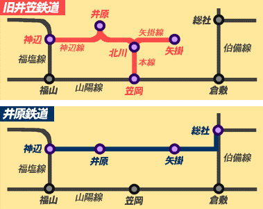 このめでたいニュースに苦言を呈するつもりはないのですが、井原鉄道が”快走”することを真に願う一人として、ちょっとだけ心配事があります。それは、井原鉄道のルートは略地図に示すように、昭和46年に廃線となった井笠鉄道のルートとかなりダブっていて、実際井笠鉄道跡に敷かれている区間もあるほどだということです(細かいことを言えば廃線前から工事は開始されていましたが・・・)。軽便鉄道と高架新線の鉄道という大きな違いはありますが、乗客減により廃線となった区間に再び鉄道が走るのです。鉄道以外の手段によって移動することに慣れてしまった沿線住民を、いかに井原鉄道の乗客として取り込んでいくのか、手腕が問われるということになります。