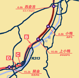 西倉吉から上小鴨までの廃線跡は完全に遊歩道化されているため、廃線跡探訪をする私たちにとってはまったく面白くない状態が続く。ただ、それぞれの駅跡は、元の敷地を利用した休憩所になっている。