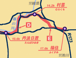 この先、福住までの間で唯一、目立った痕跡を残しているのは、E地点の切通しである。道路に沿って、ちょうど単線鉄道分の幅をあけて、北側の山が削り取られている。もともと道路より一段低かった線路跡は、道路の高さまで埋められ、木々も茂り、しかもデカンショ街道という訳の分からない(失礼)碑まで建てられているが、それでも山あいの鉄道でよくみられる風景そのものの、明らかに線路跡とわかる遺構である。