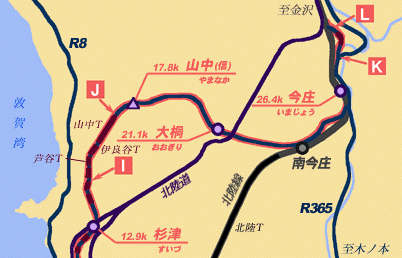 杉津から先は北陸道と別れることにより、人工的な音が周りから消えて、鳥のさえずりが急に耳に入るようになる。道の通行量は杉津までと変わらないのに、音が静かになるだけで、落ちついてトンネルの中なども観ることができるようになるのは、不思議なものである。